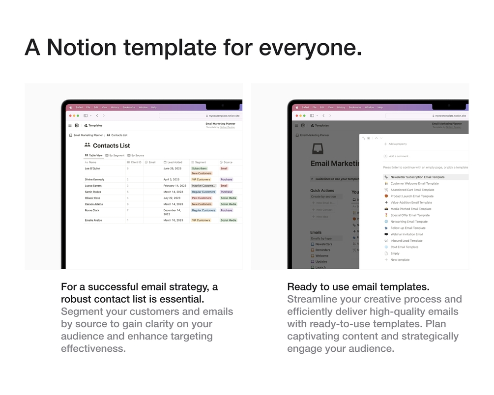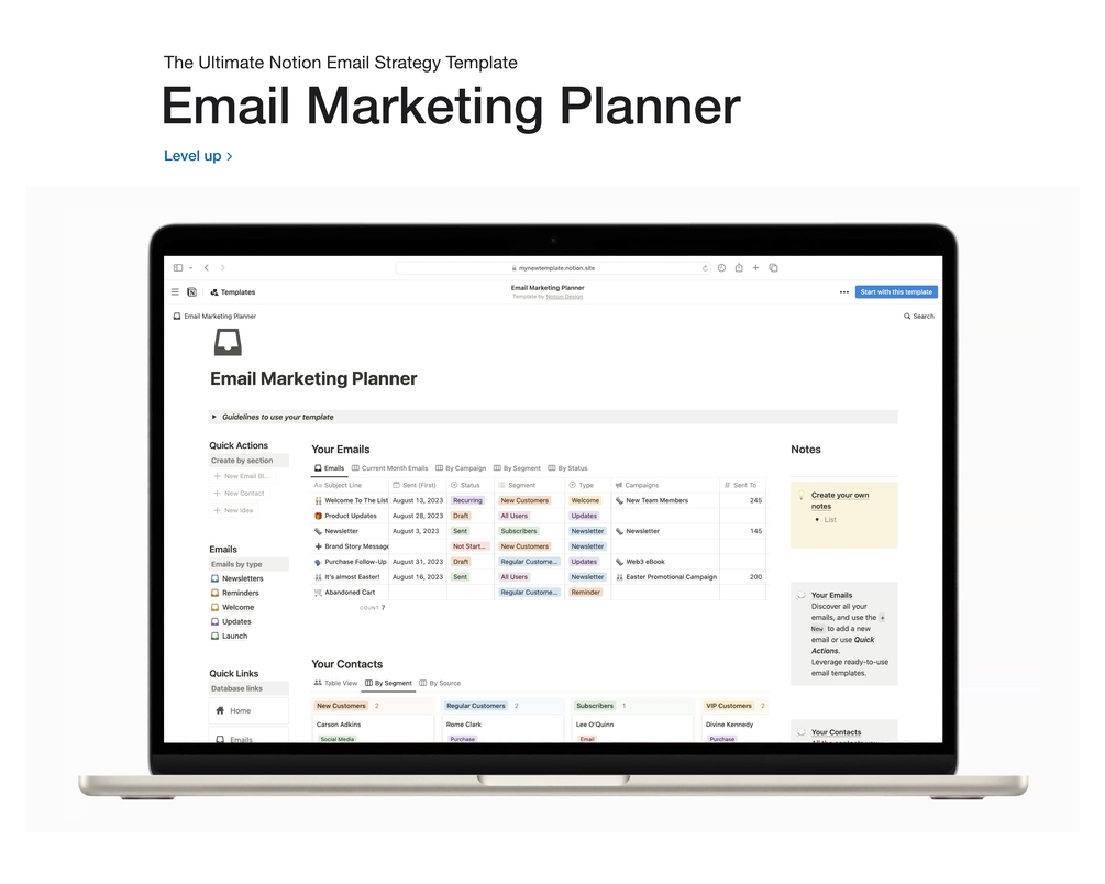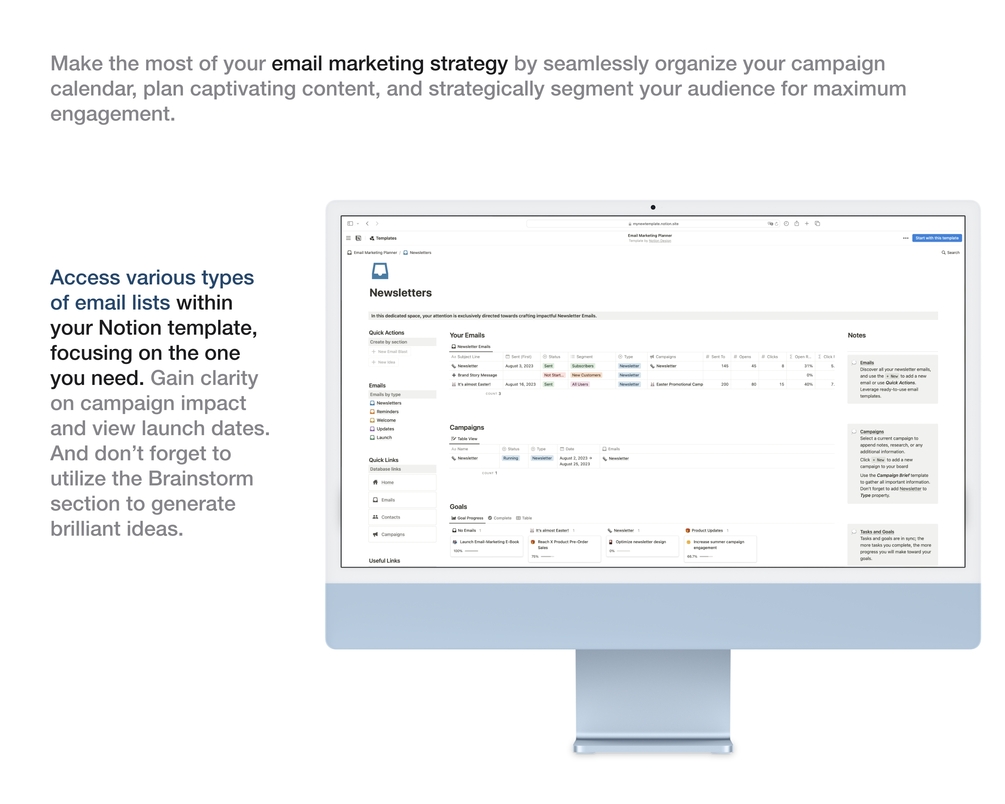 Crafted for small e-businesses, freelancers, and content creators, this Notion template is the ultimate tool to design, schedule, and optimize your email campaigns.