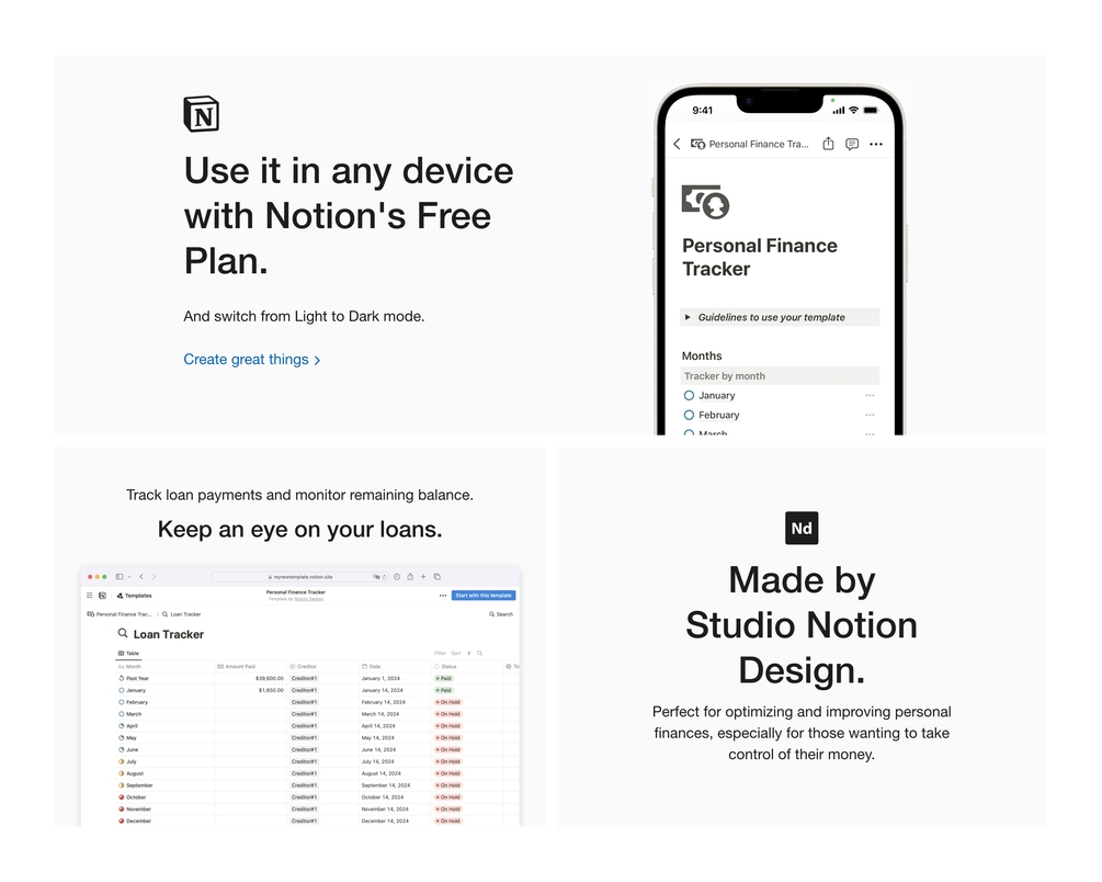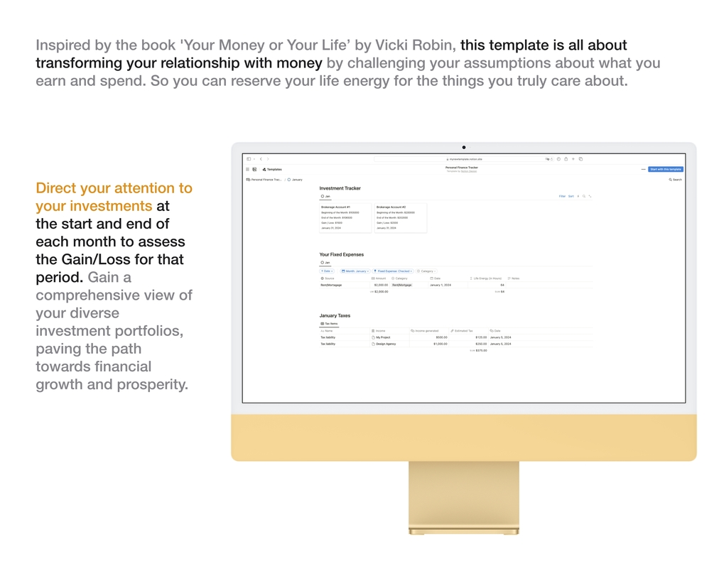 Crafted for individuals seeking to organize their finances and take control of their money, this Notion template is the ultimate tool to track, schedule, and optimize your financials.